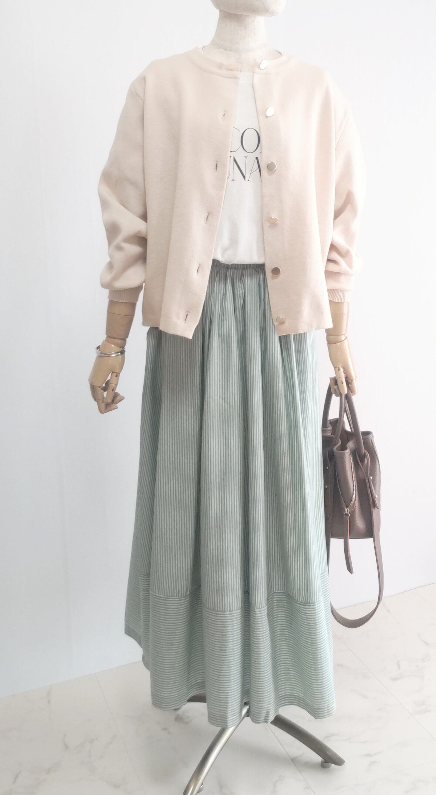 ミラノリブのしっかりした素材でボディラインを拾いにくく、きちんと感も演出してくれます。