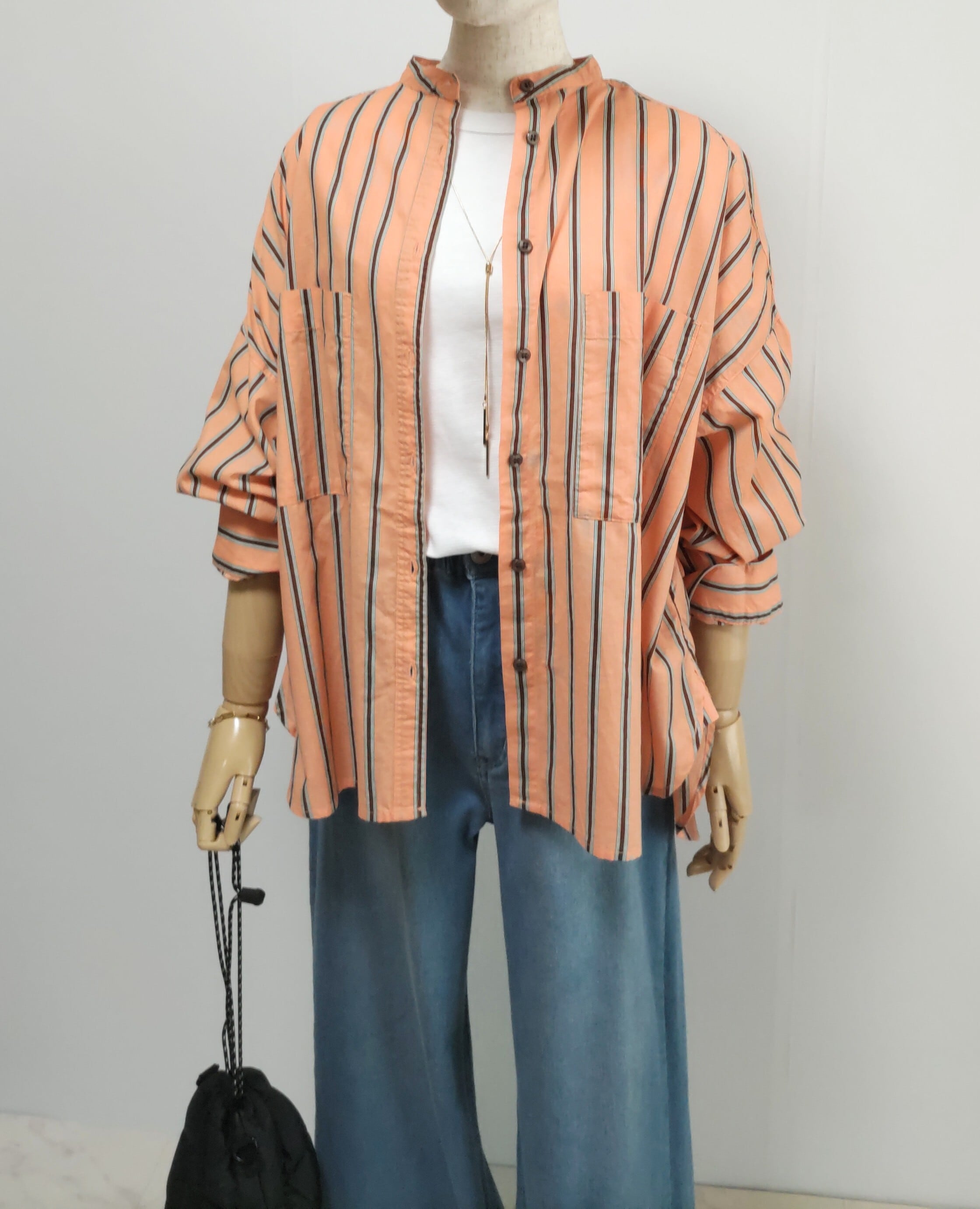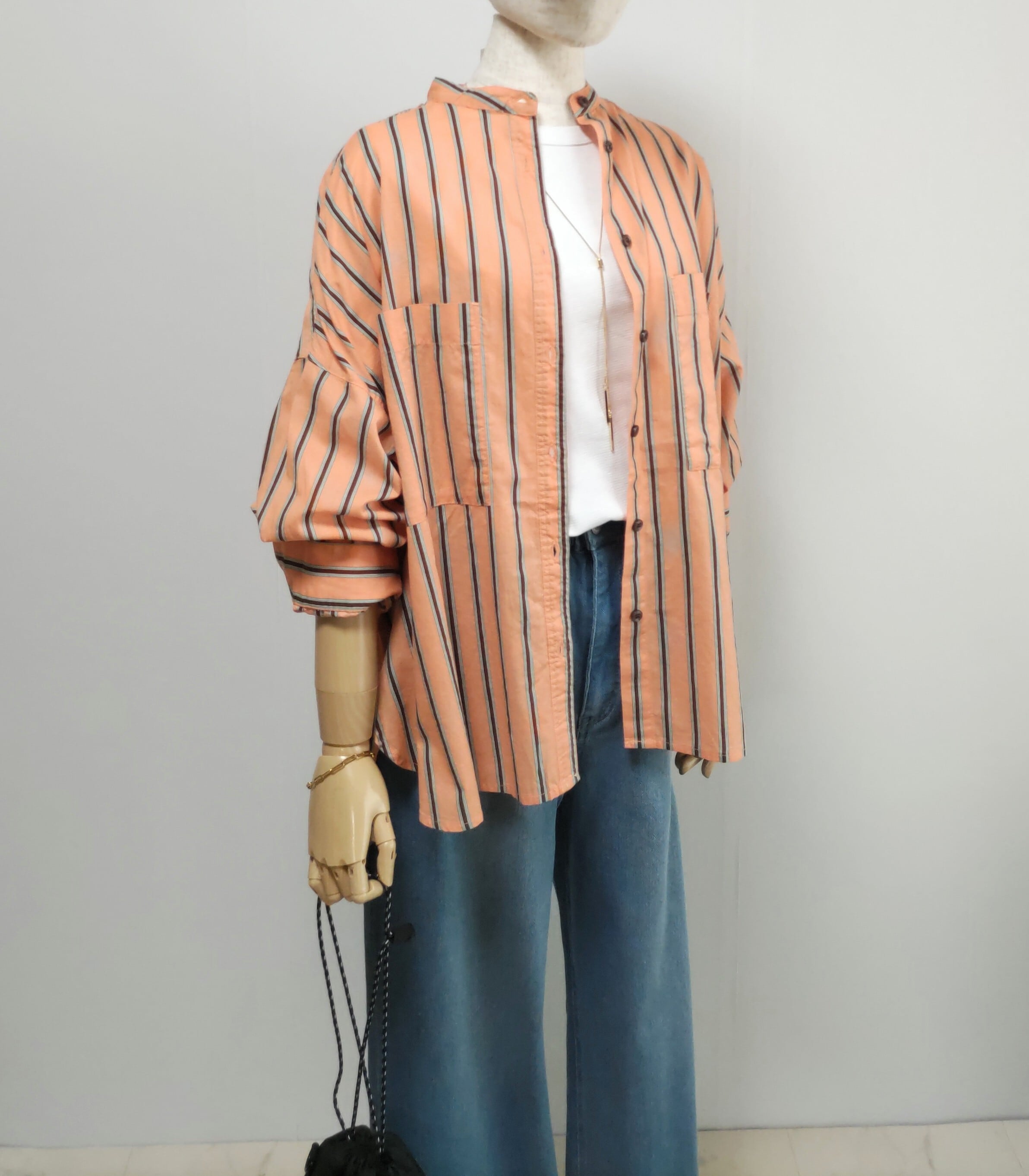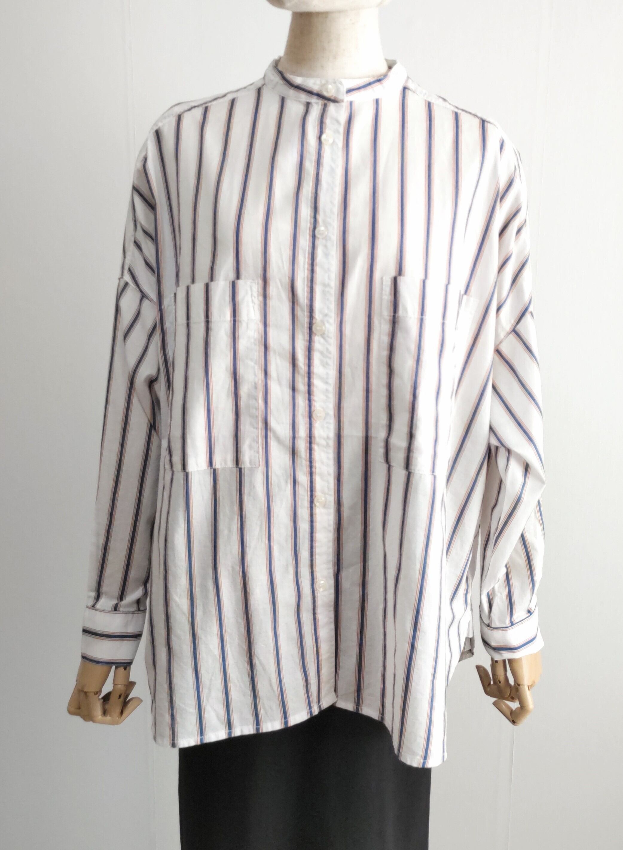 インパクトのあるストライプ柄がオシャレなバンドカラーシャツ。