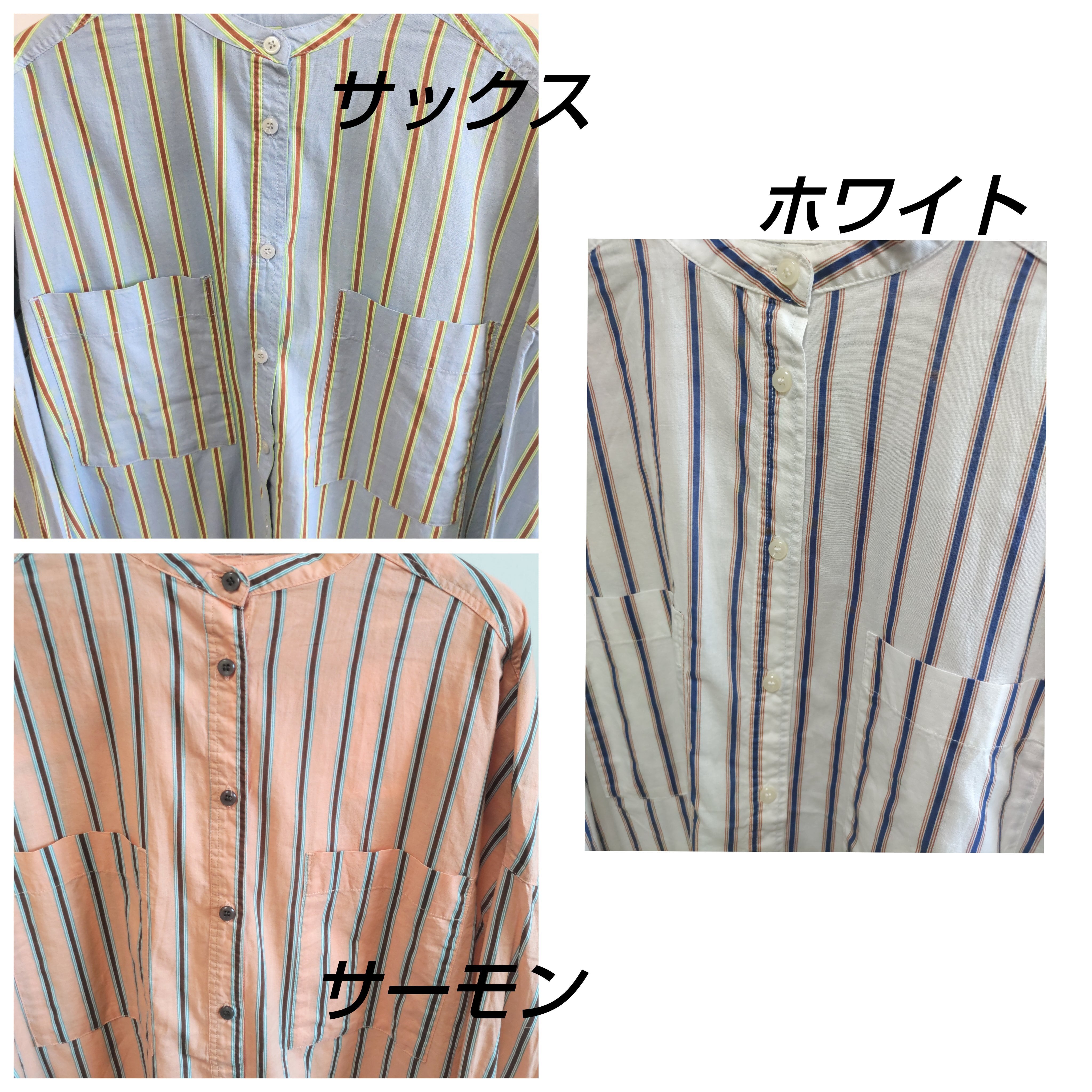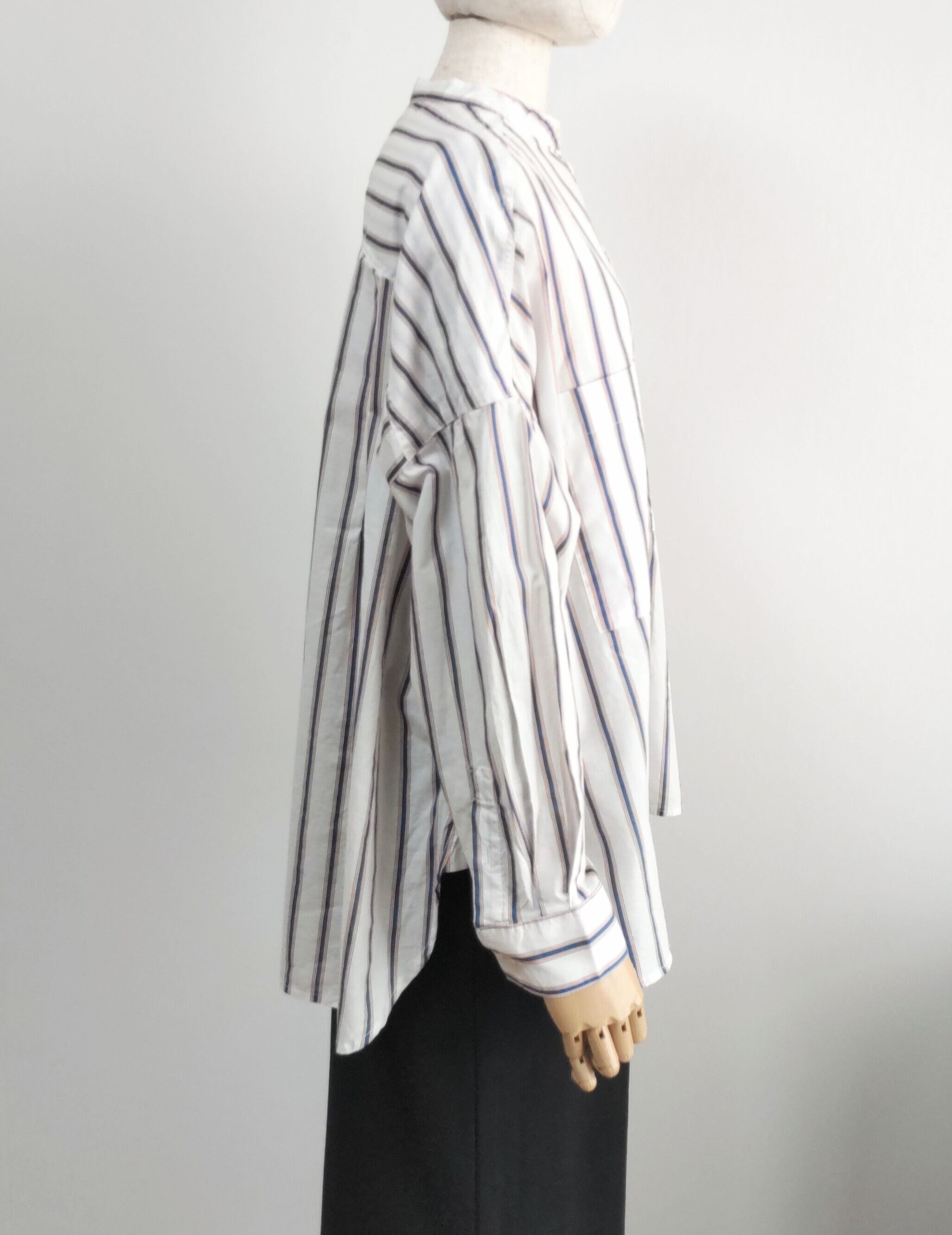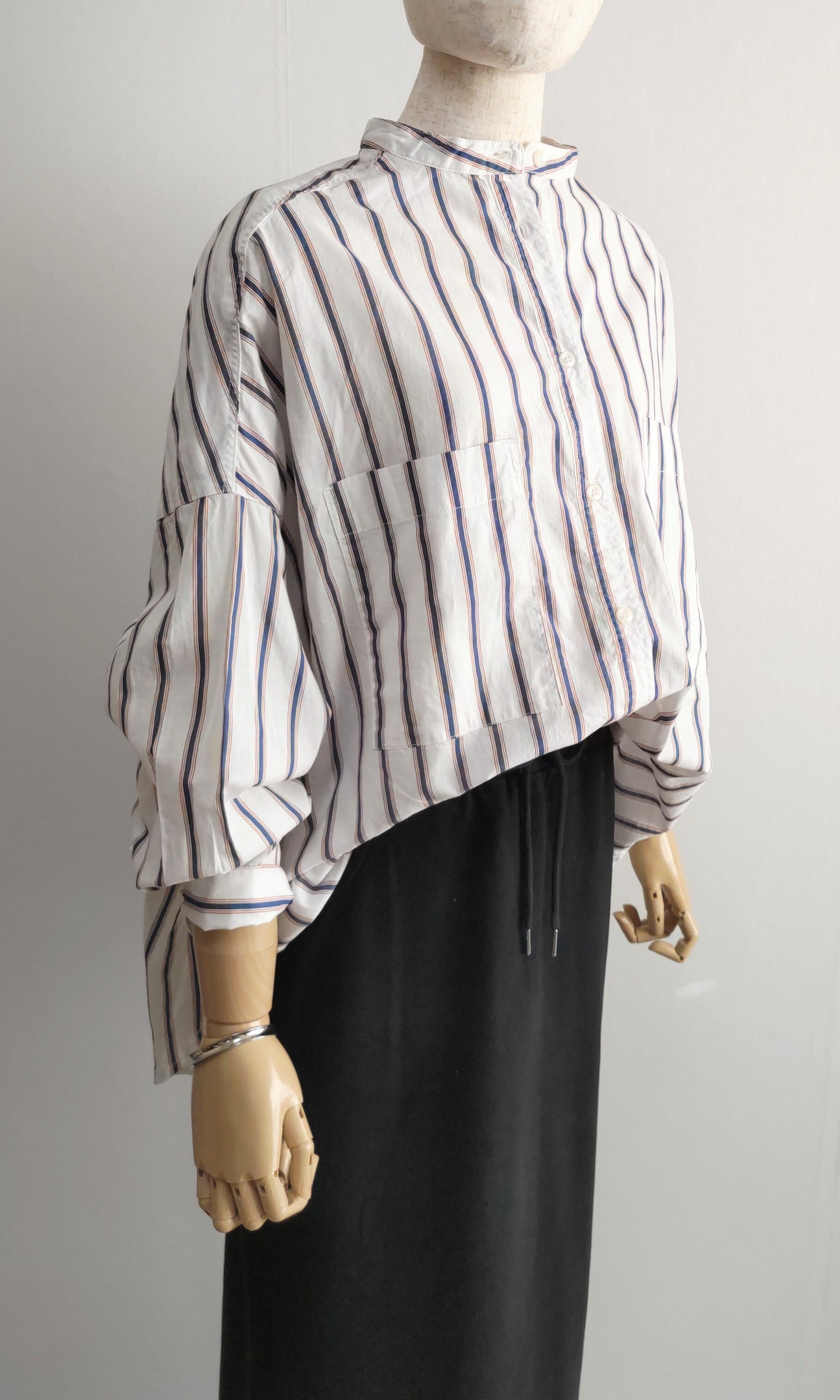 インパクトのあるストライプ柄がオシャレなバンドカラーシャツ。