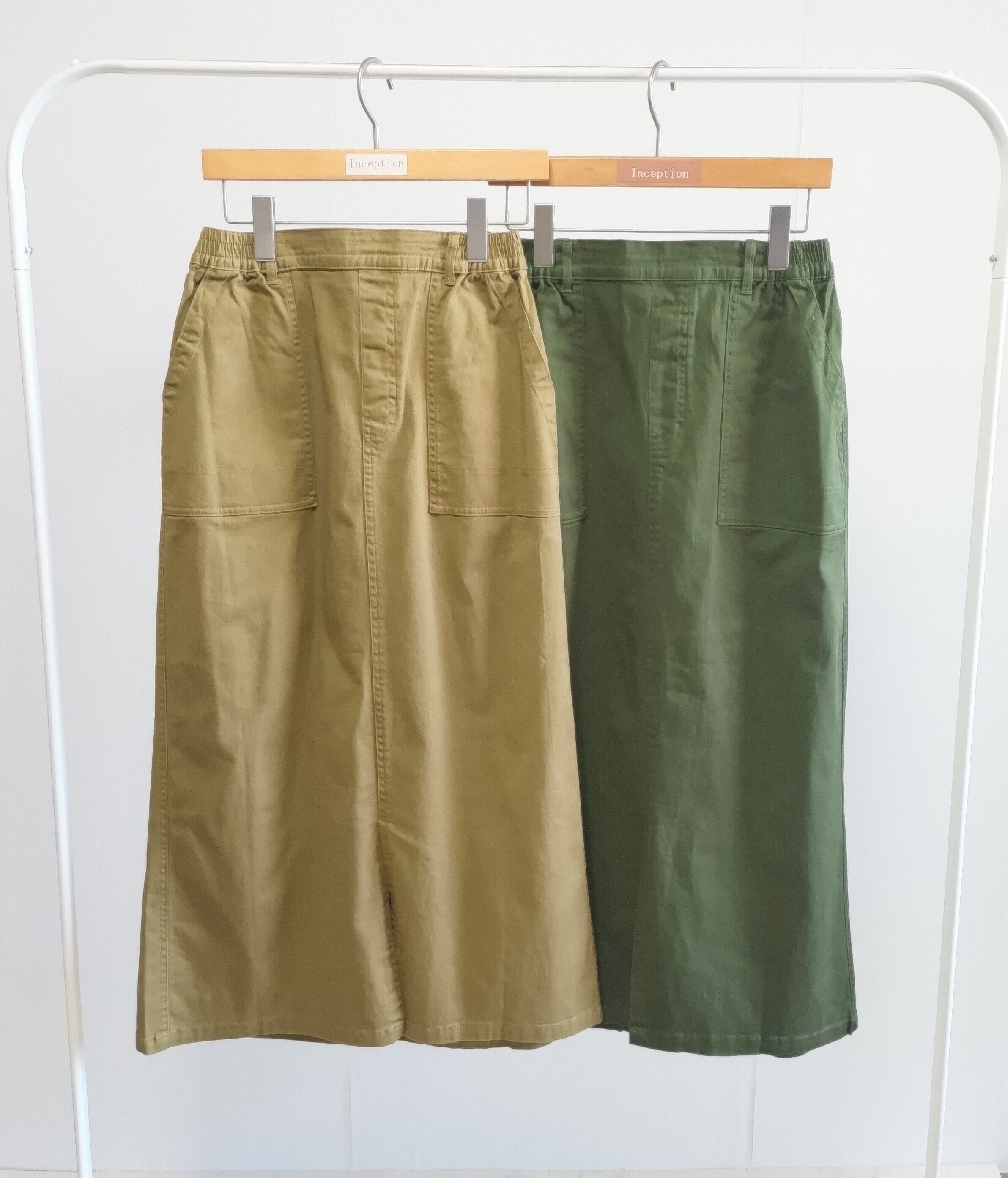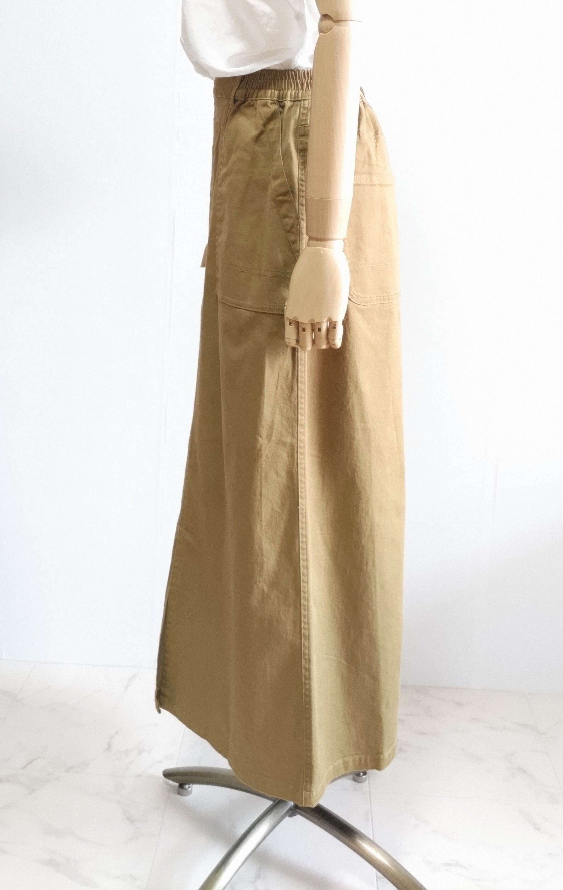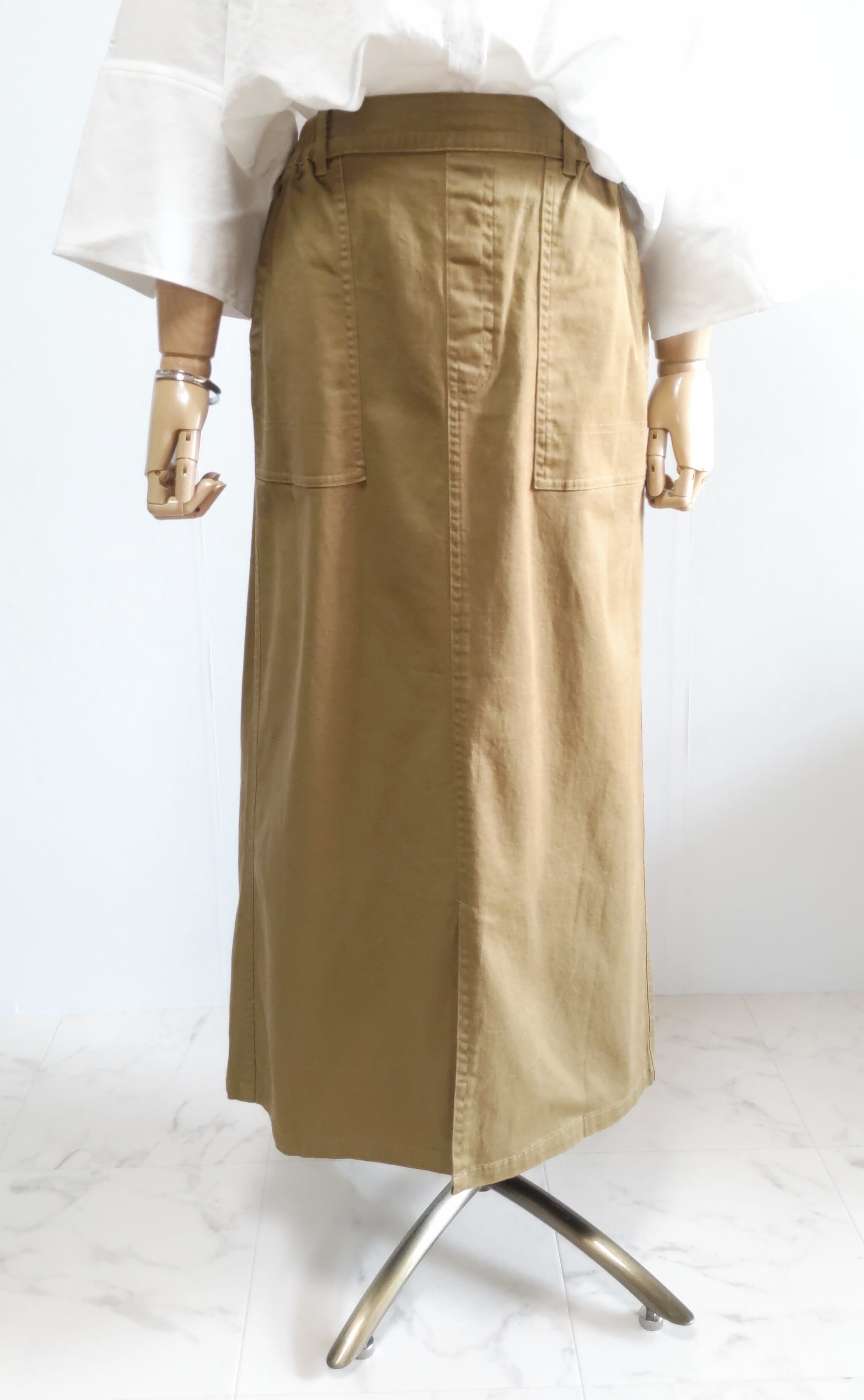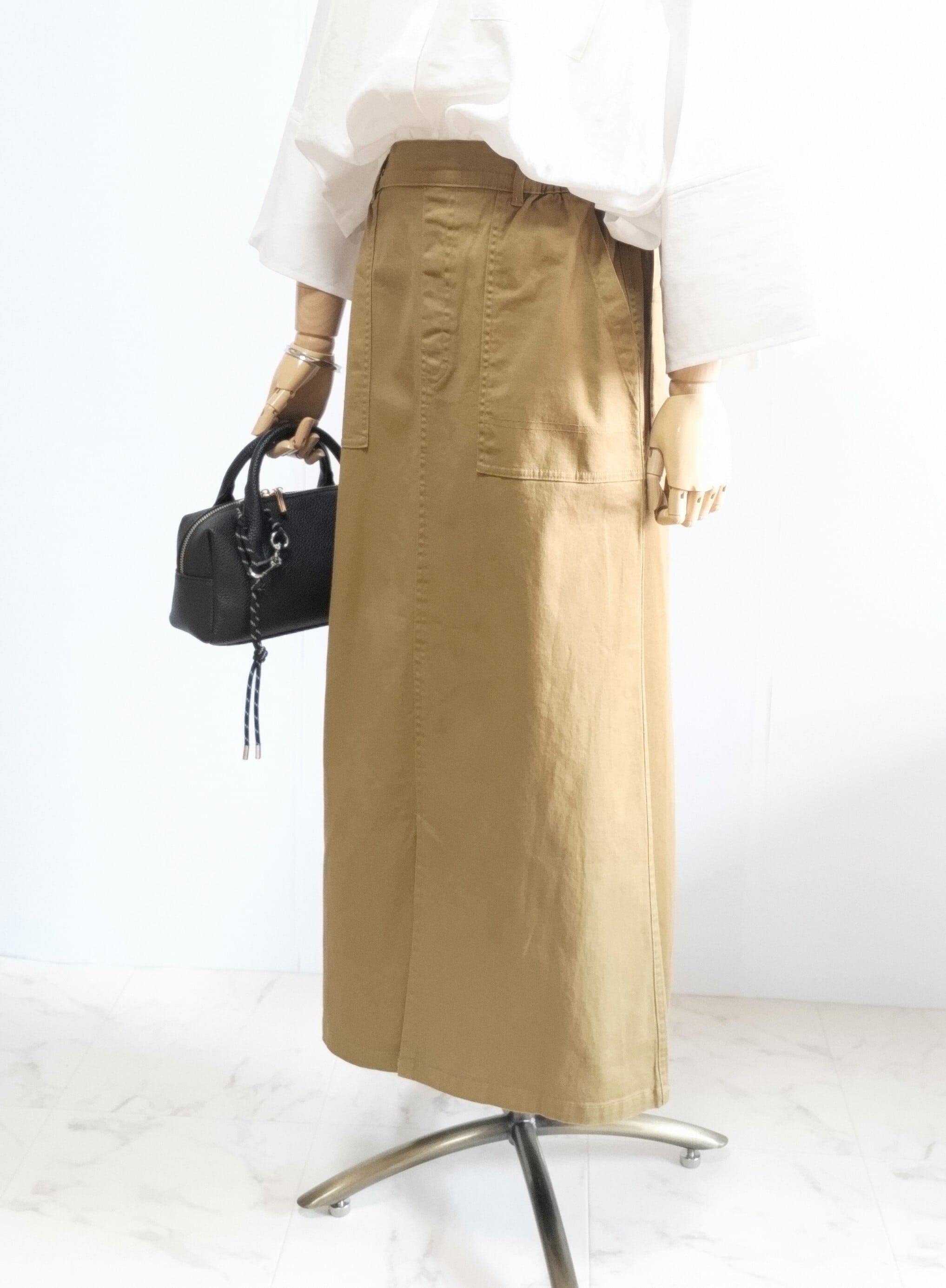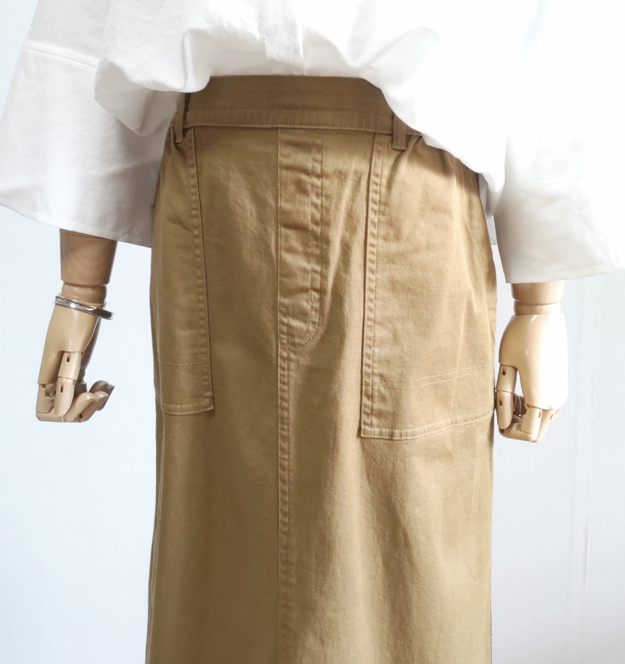 ポケットのデザインがアクセントのストレッチベイカースカート。