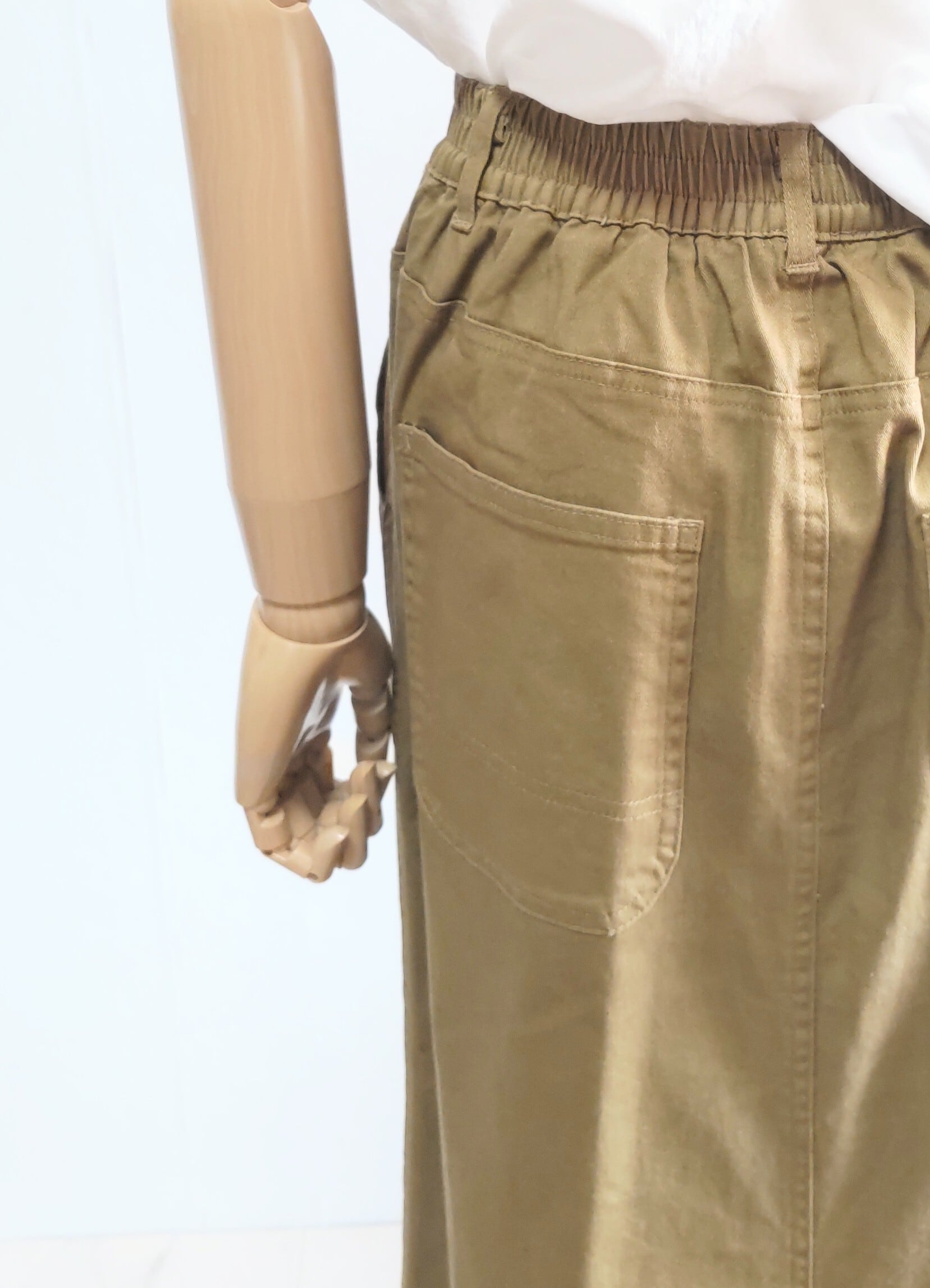 ウエスト後ろはゴム仕様、裾にはスリットが入っていて動きやすさも抜群。
