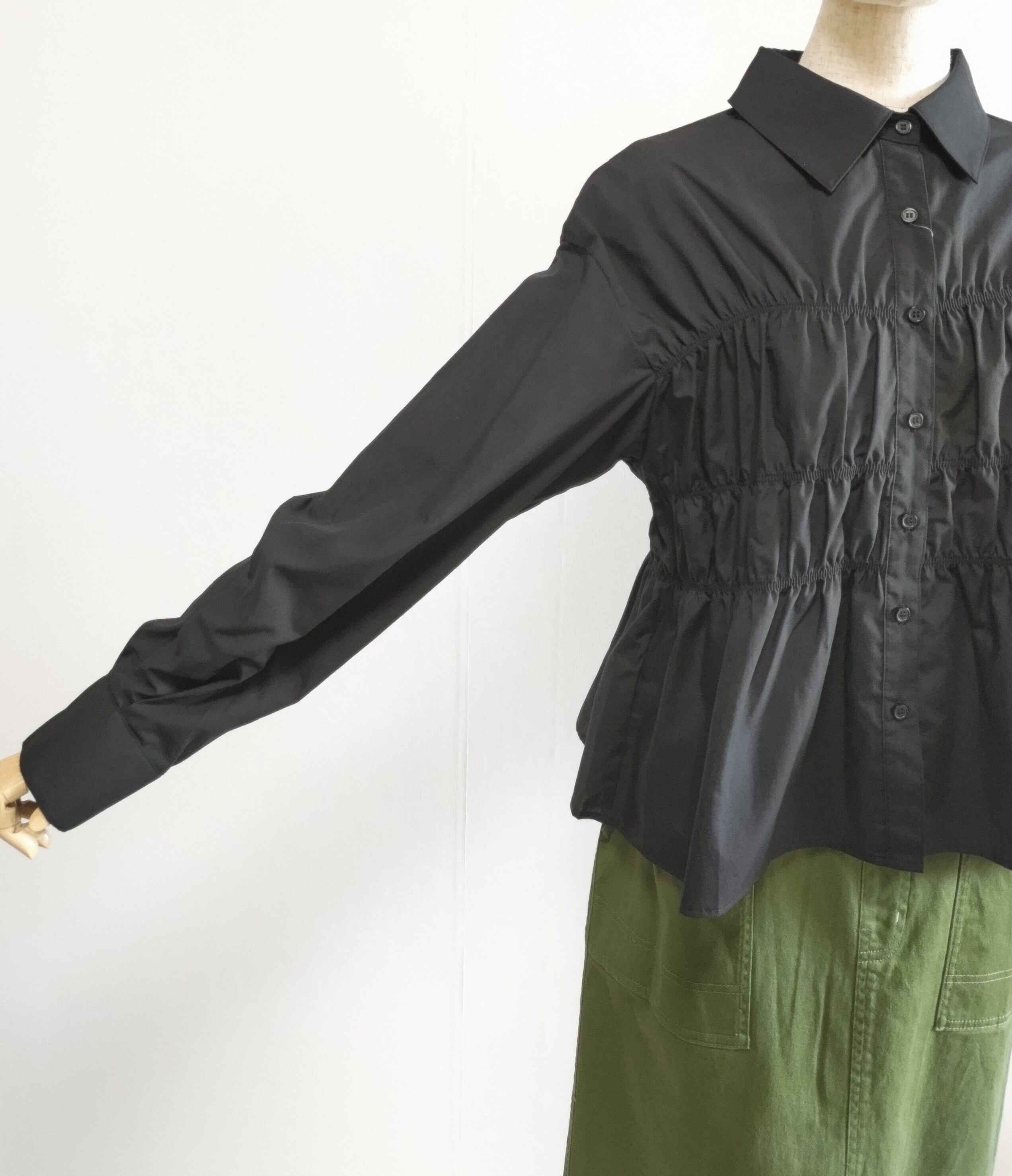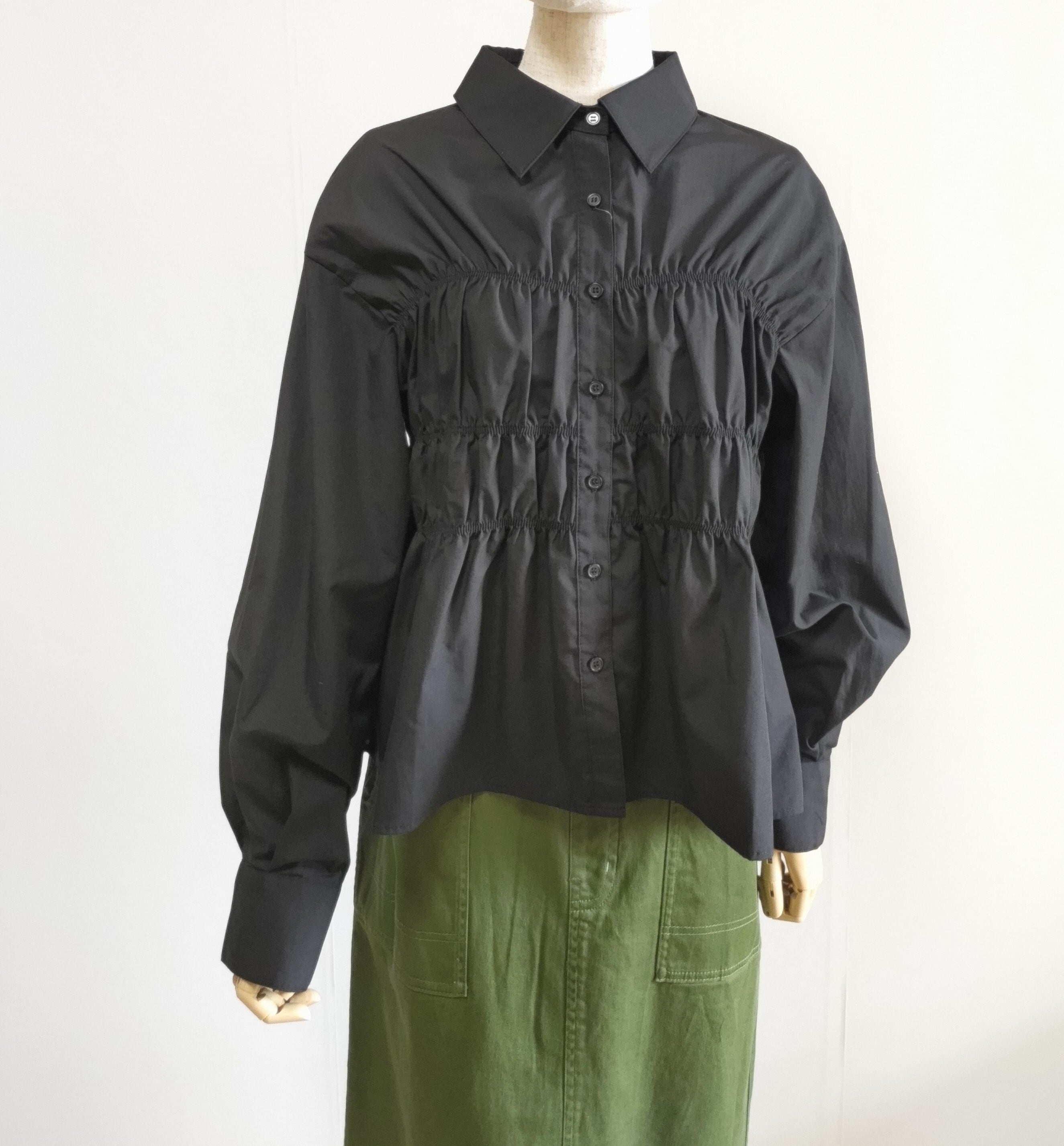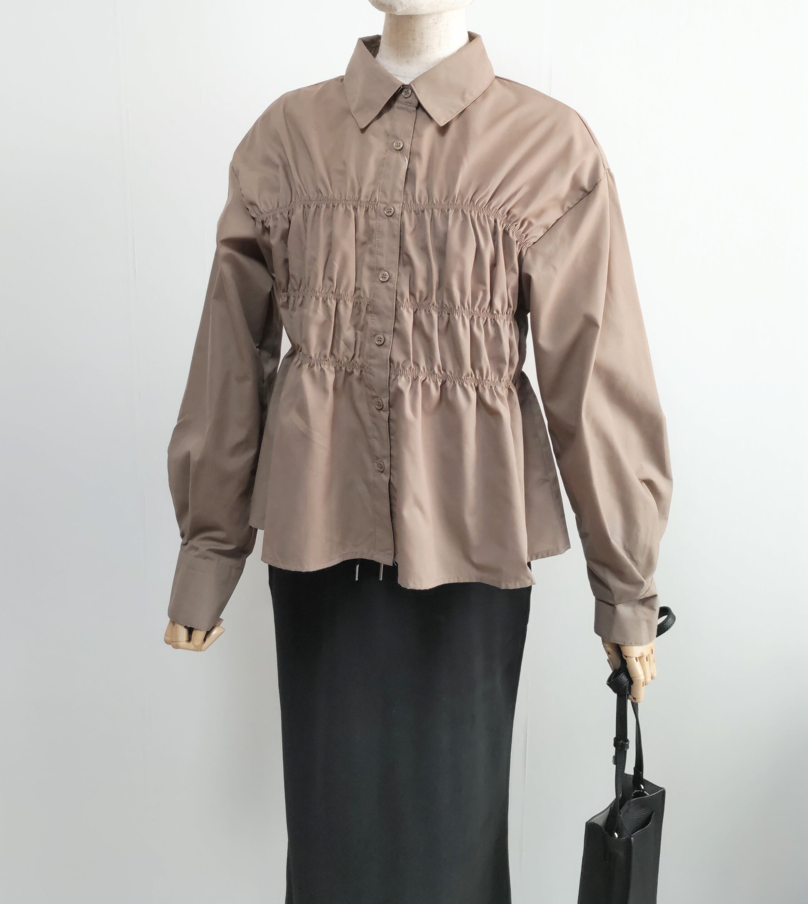 胸元からウエストにかけて施されたシャーリングが可愛いブラウス。