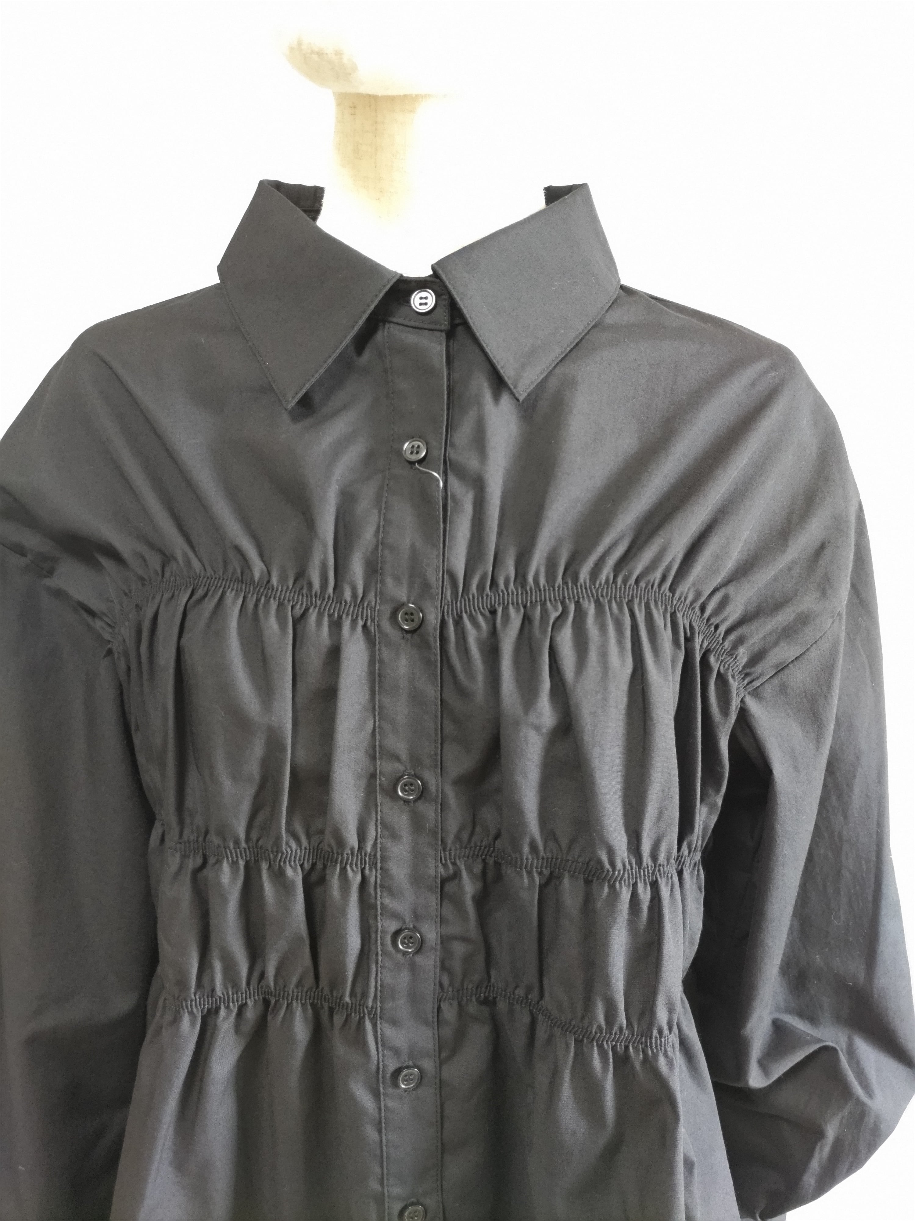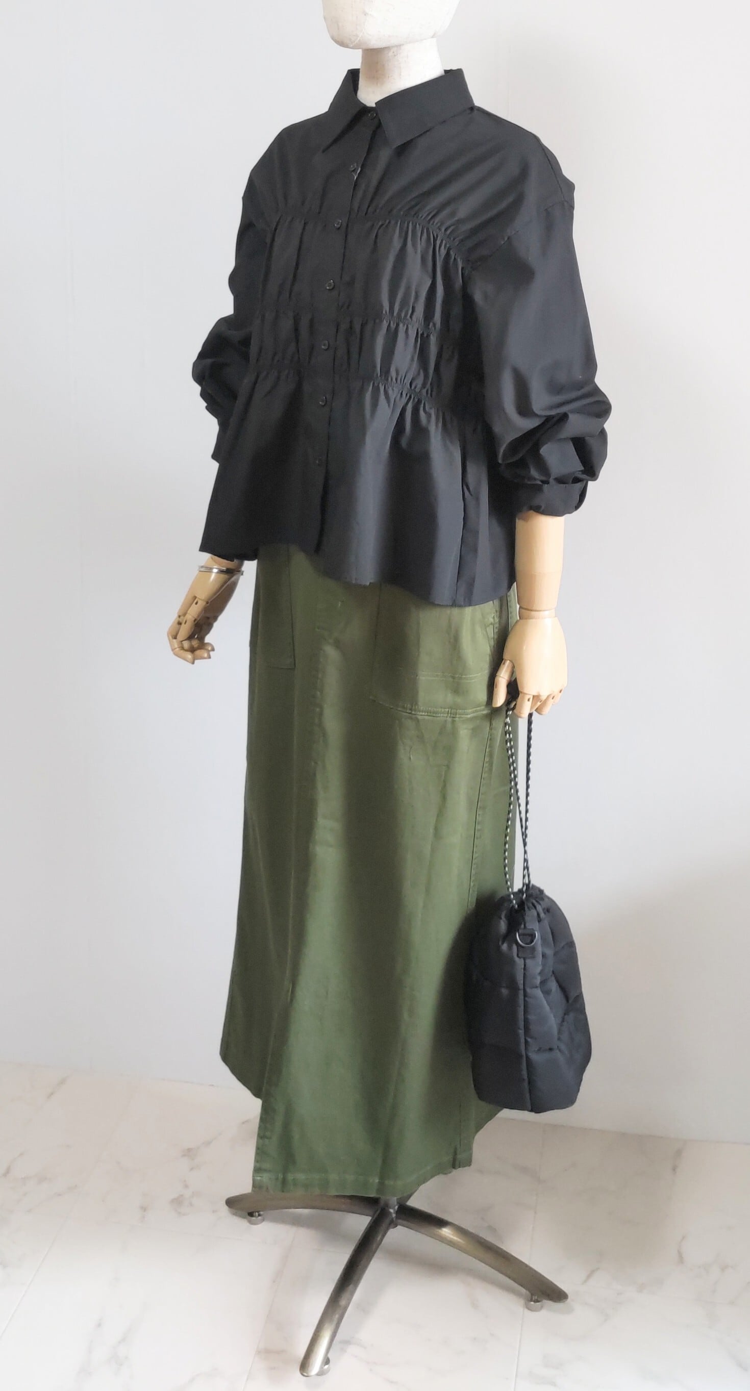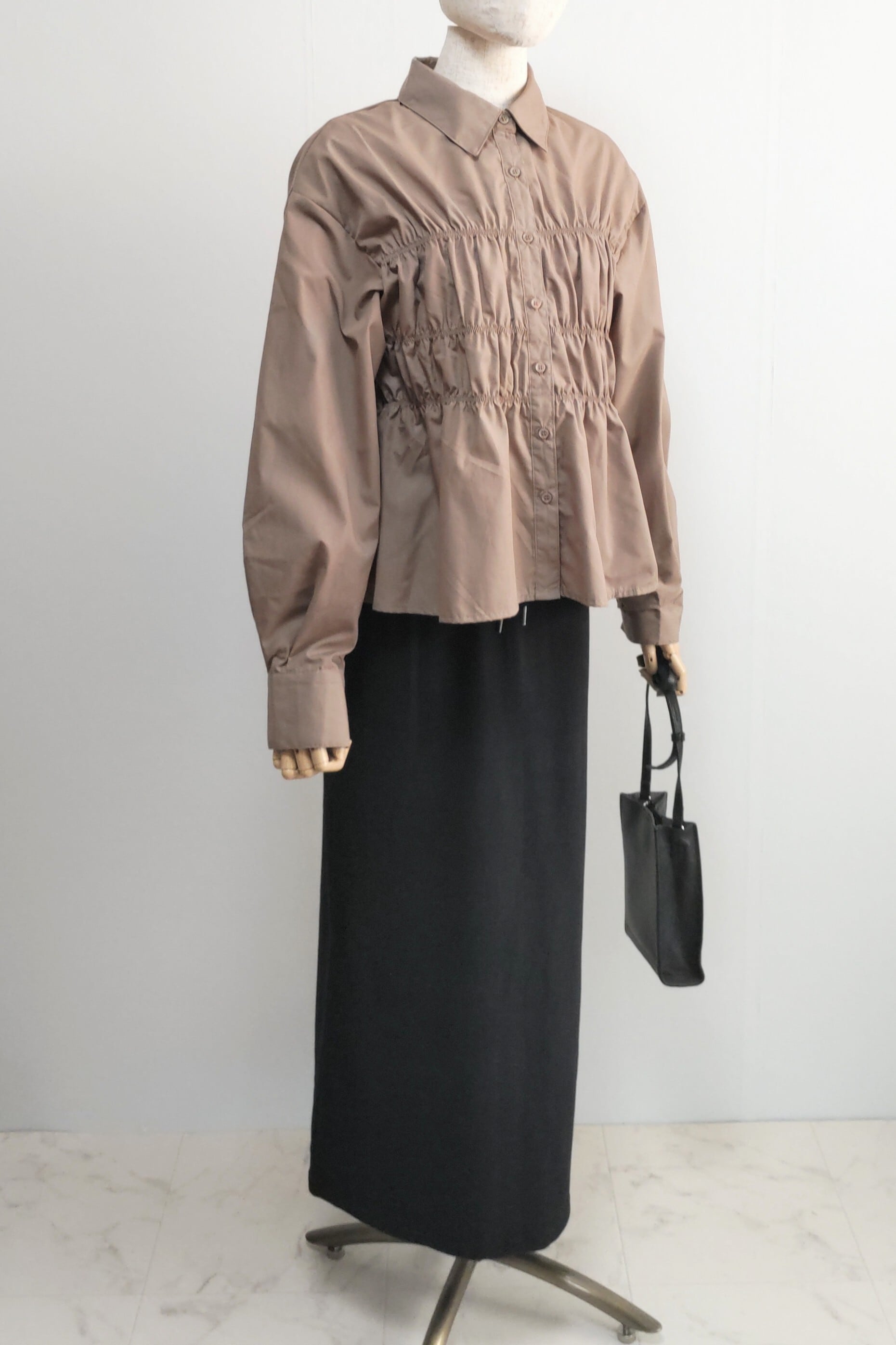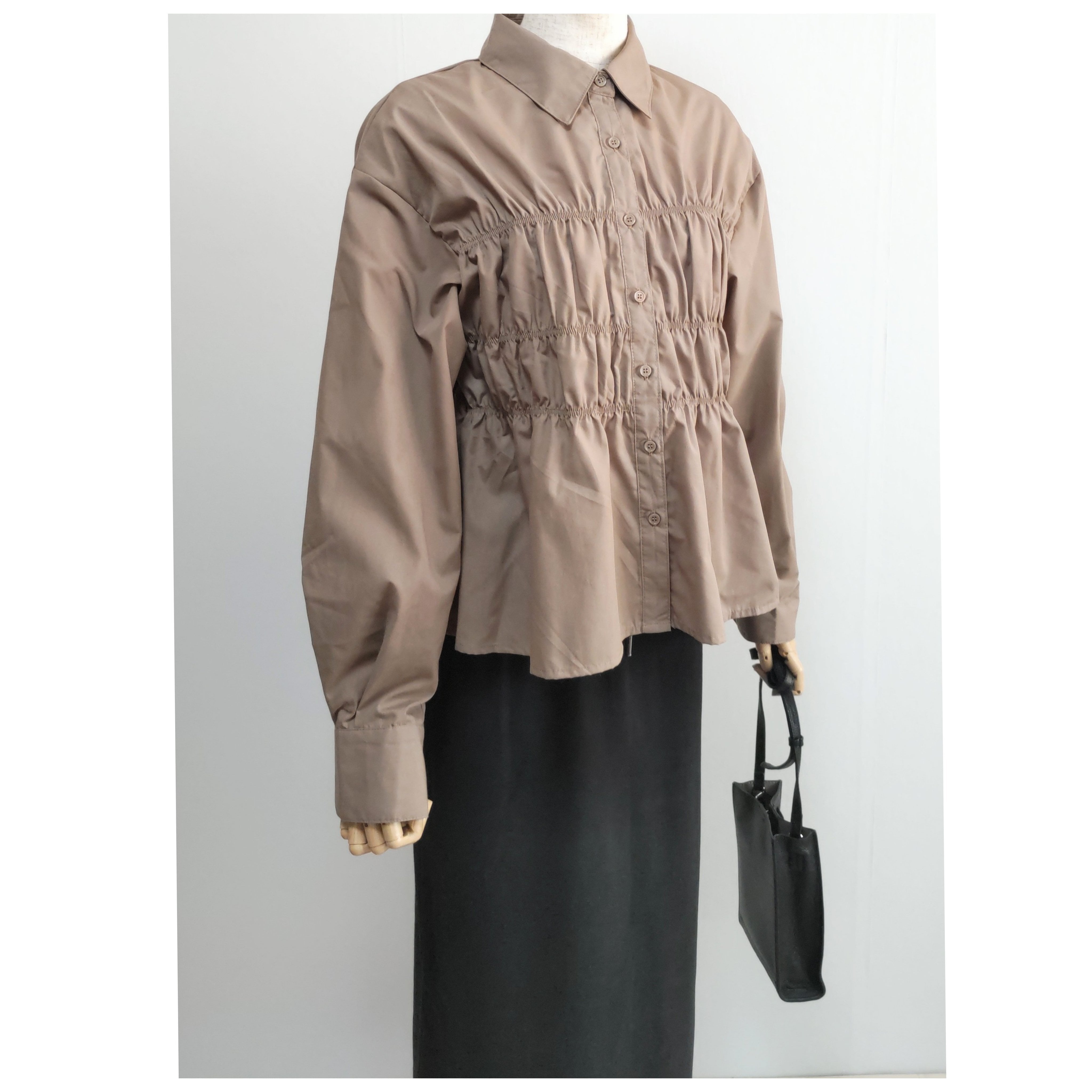 胸元からウエストにかけて施されたシャーリングが可愛いブラウス。