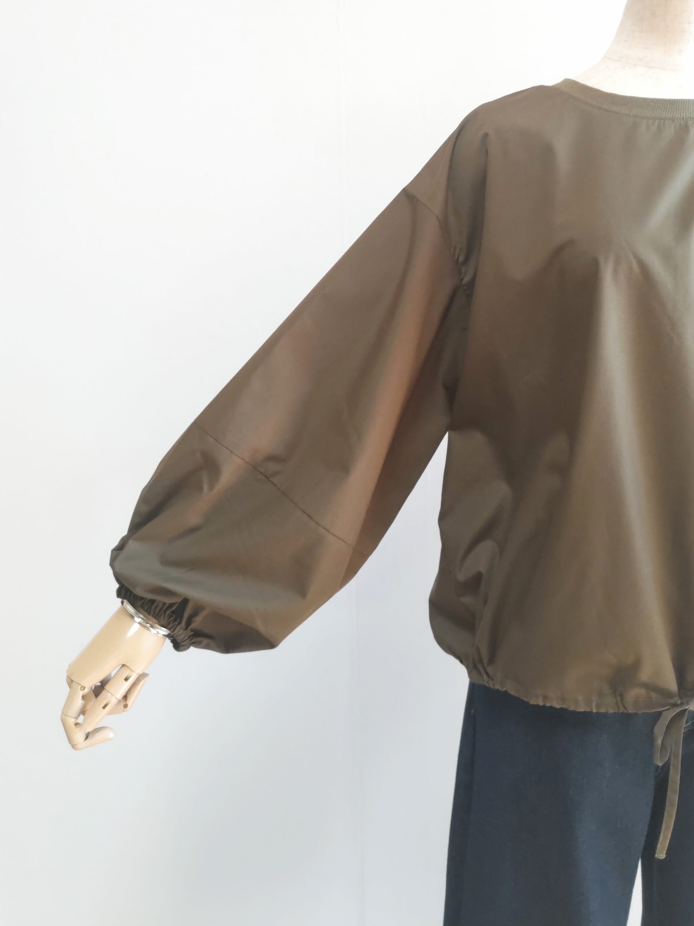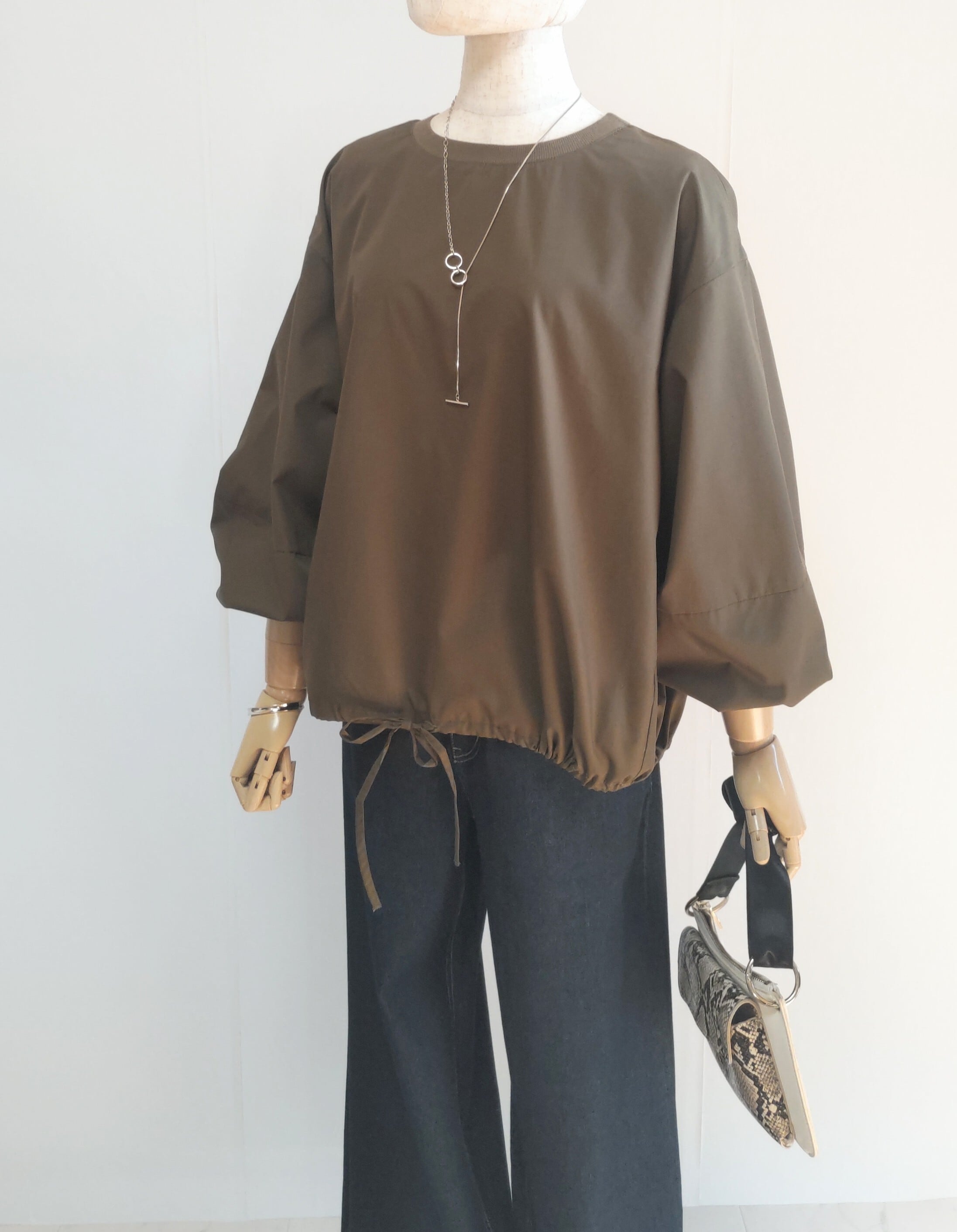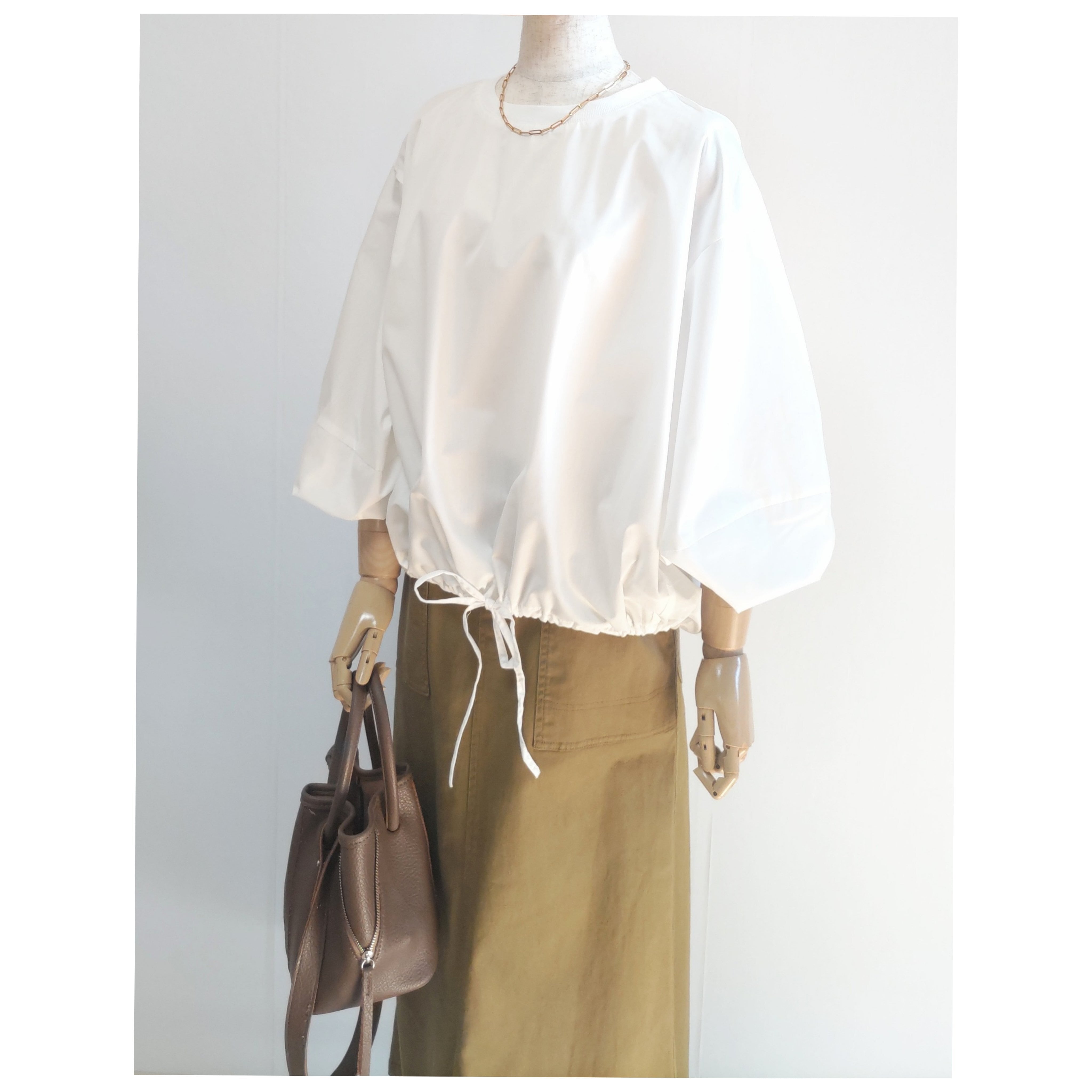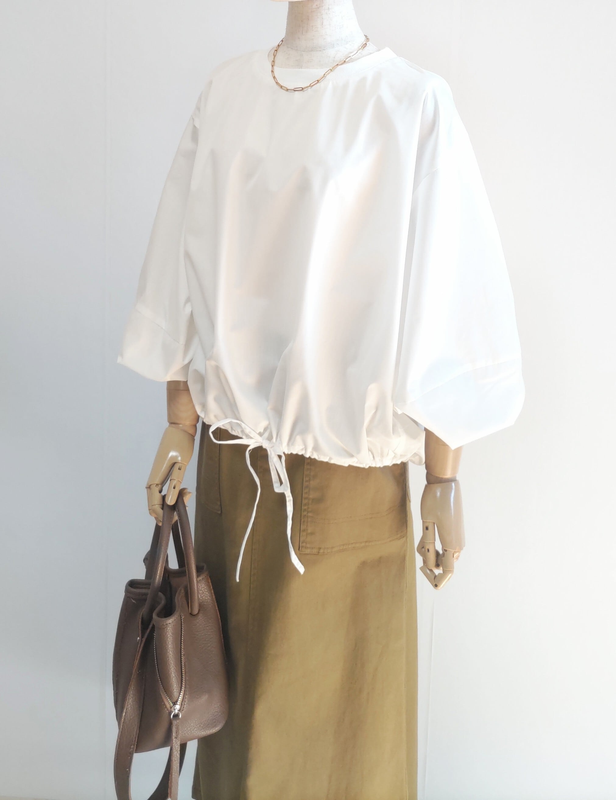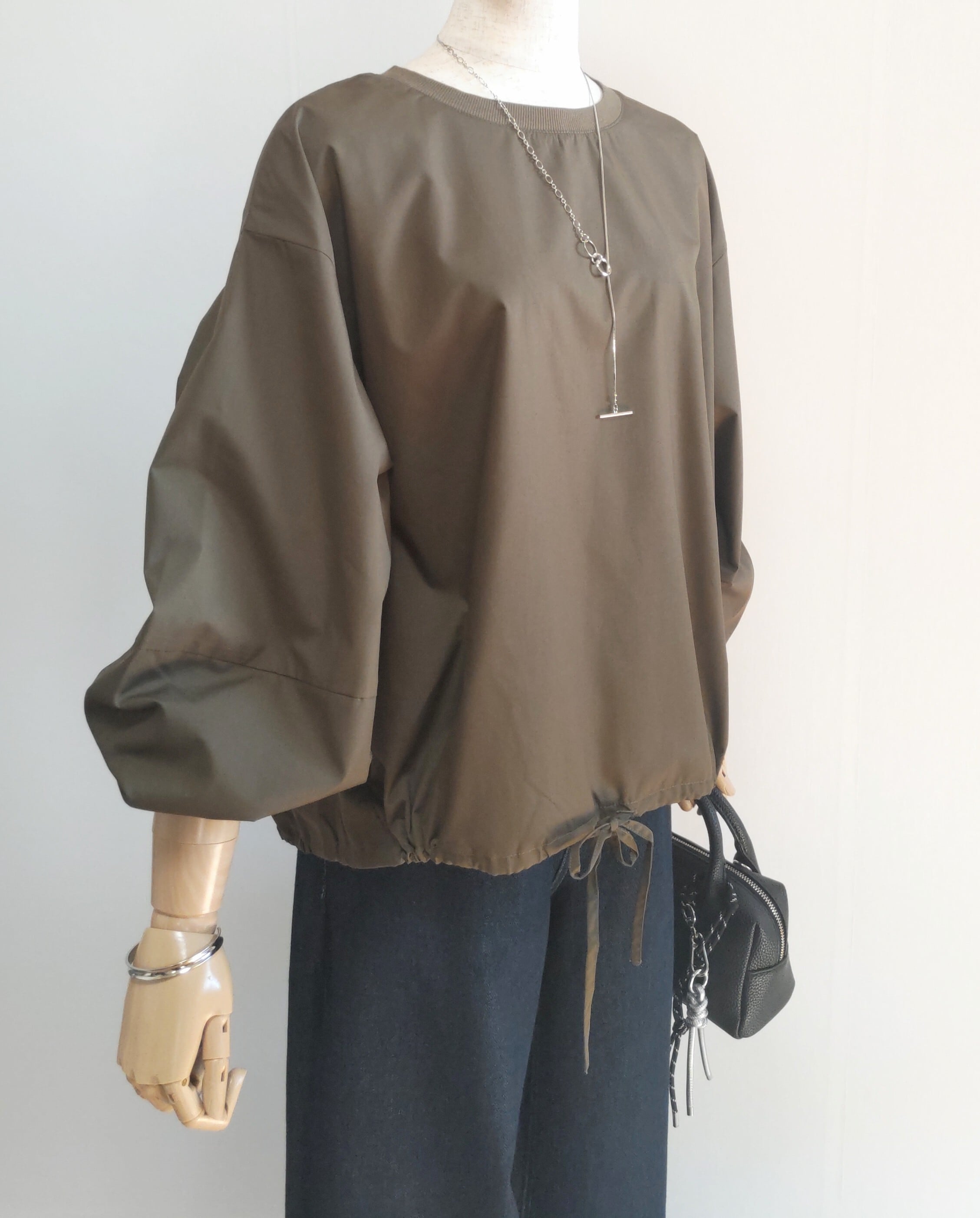 裾部分の紐でお好みのシルエットに調節可能。丸みのあるバルーン型に変更することもできます。