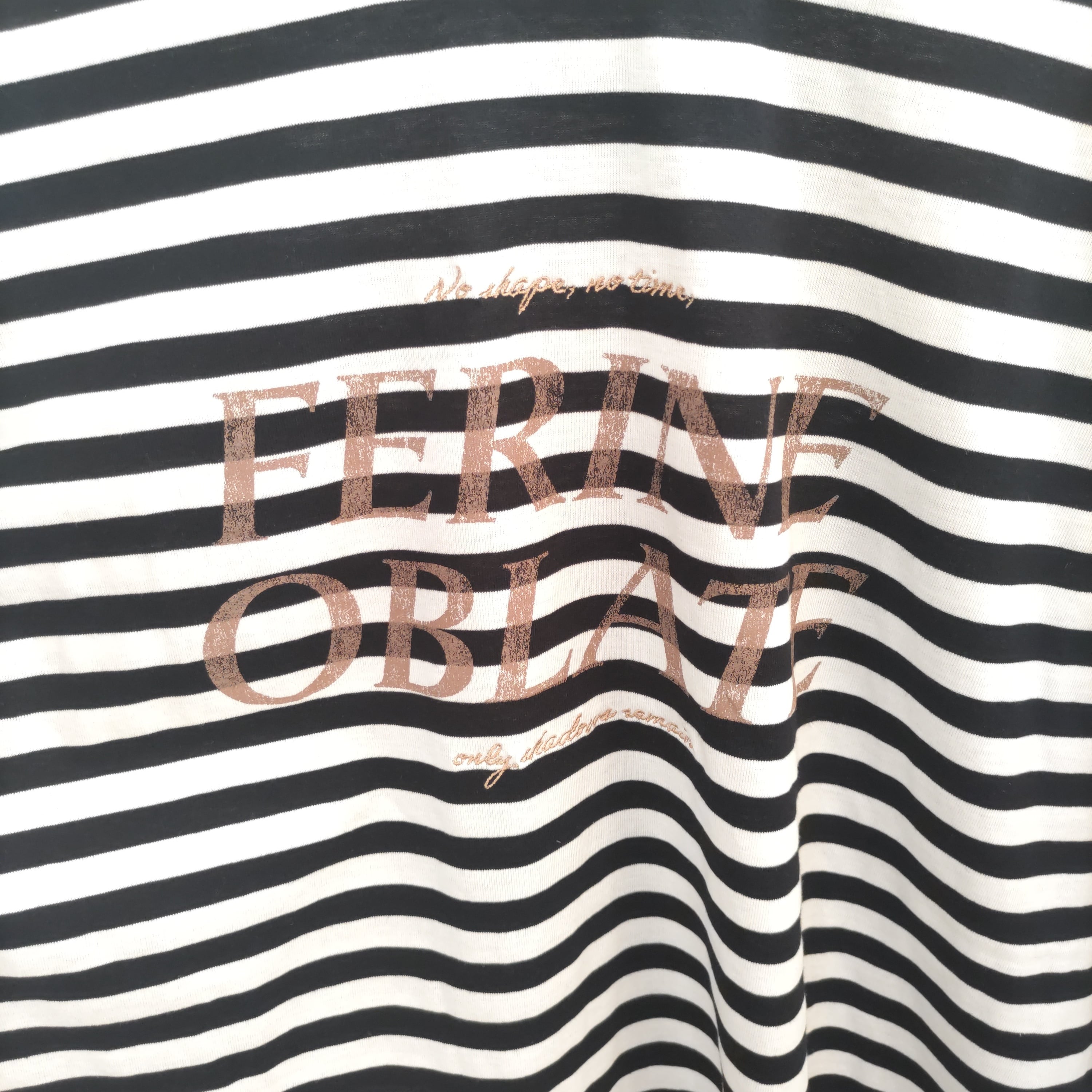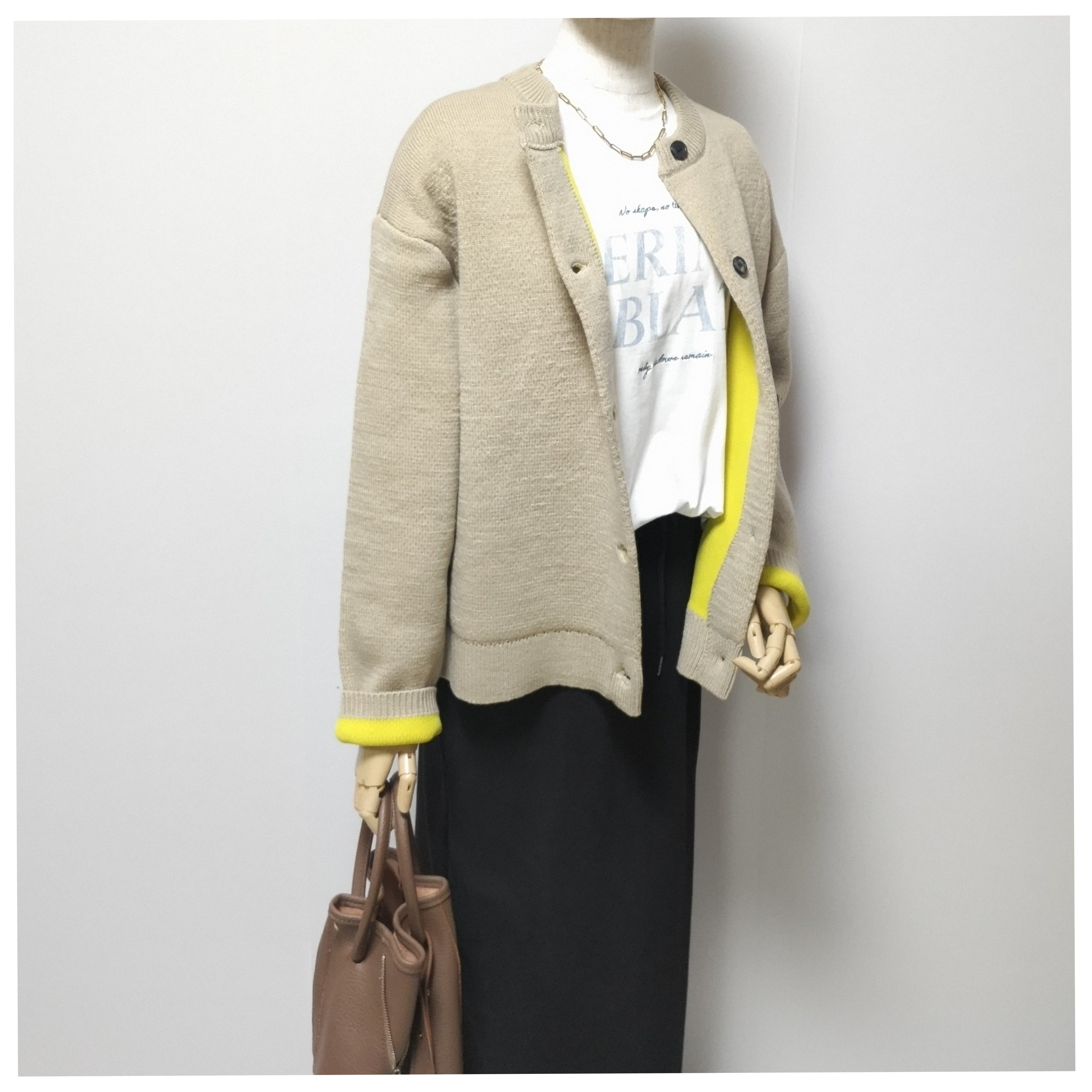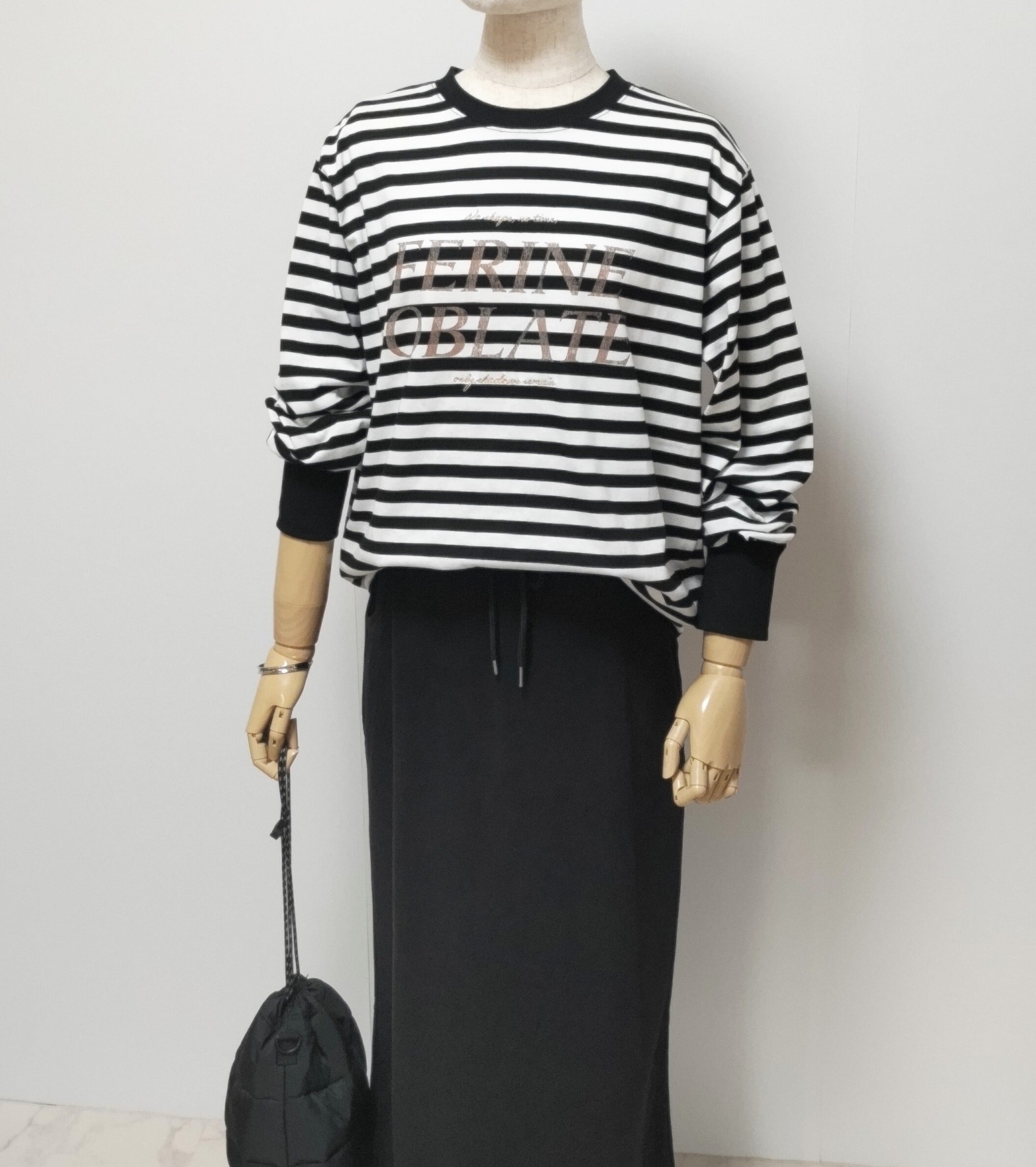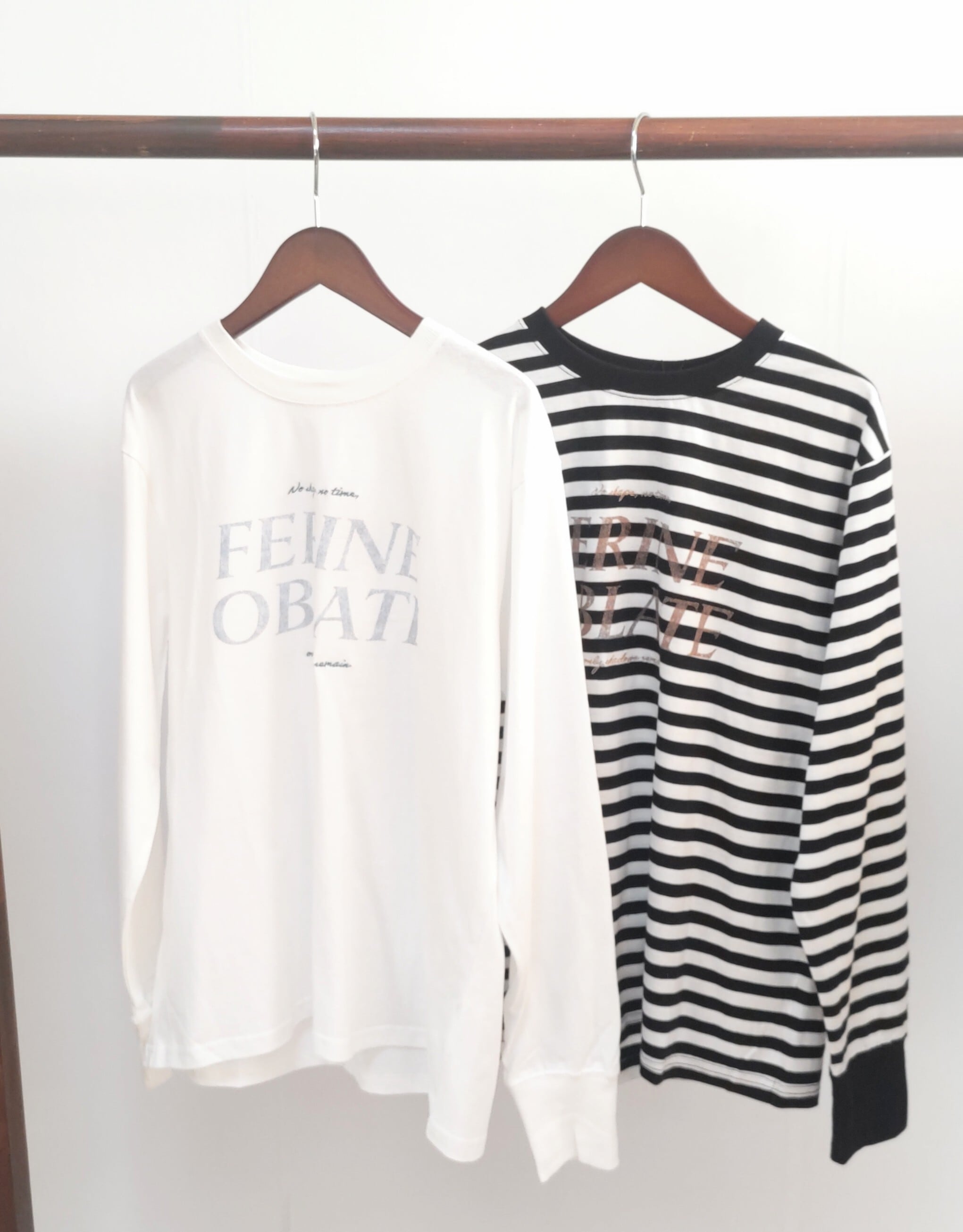 ジャンパースカートやカーディガンのインナーとしてロゴをチラ見せしたり、ワイドパンツと合わせてリラックス感のあるスタイルに。