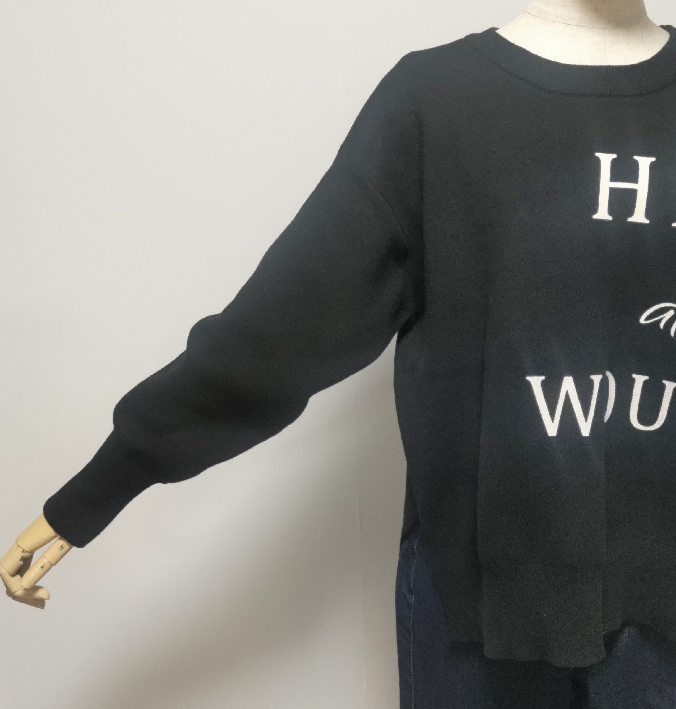 フロントからサイドにプリントされたロゴが大人カジュアルなニット。