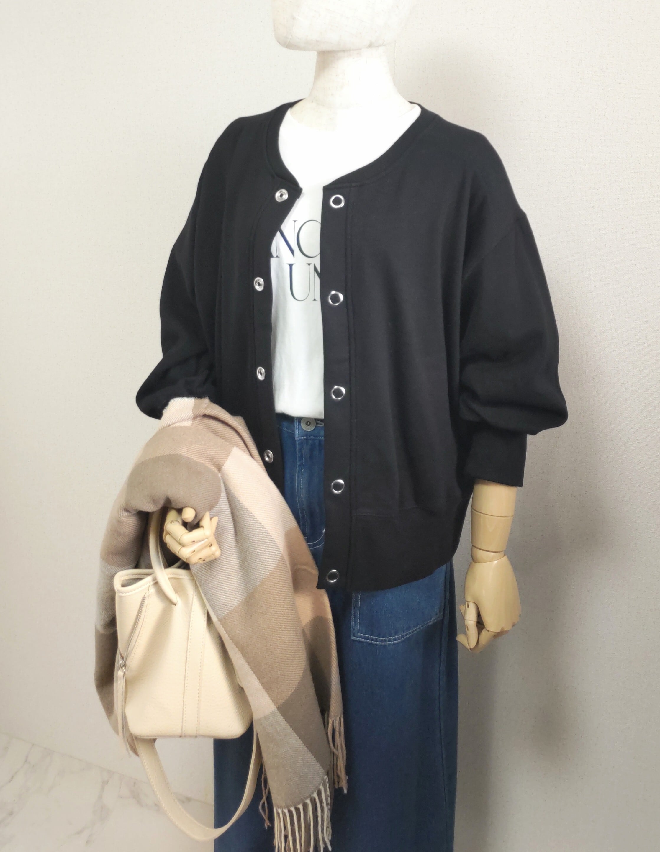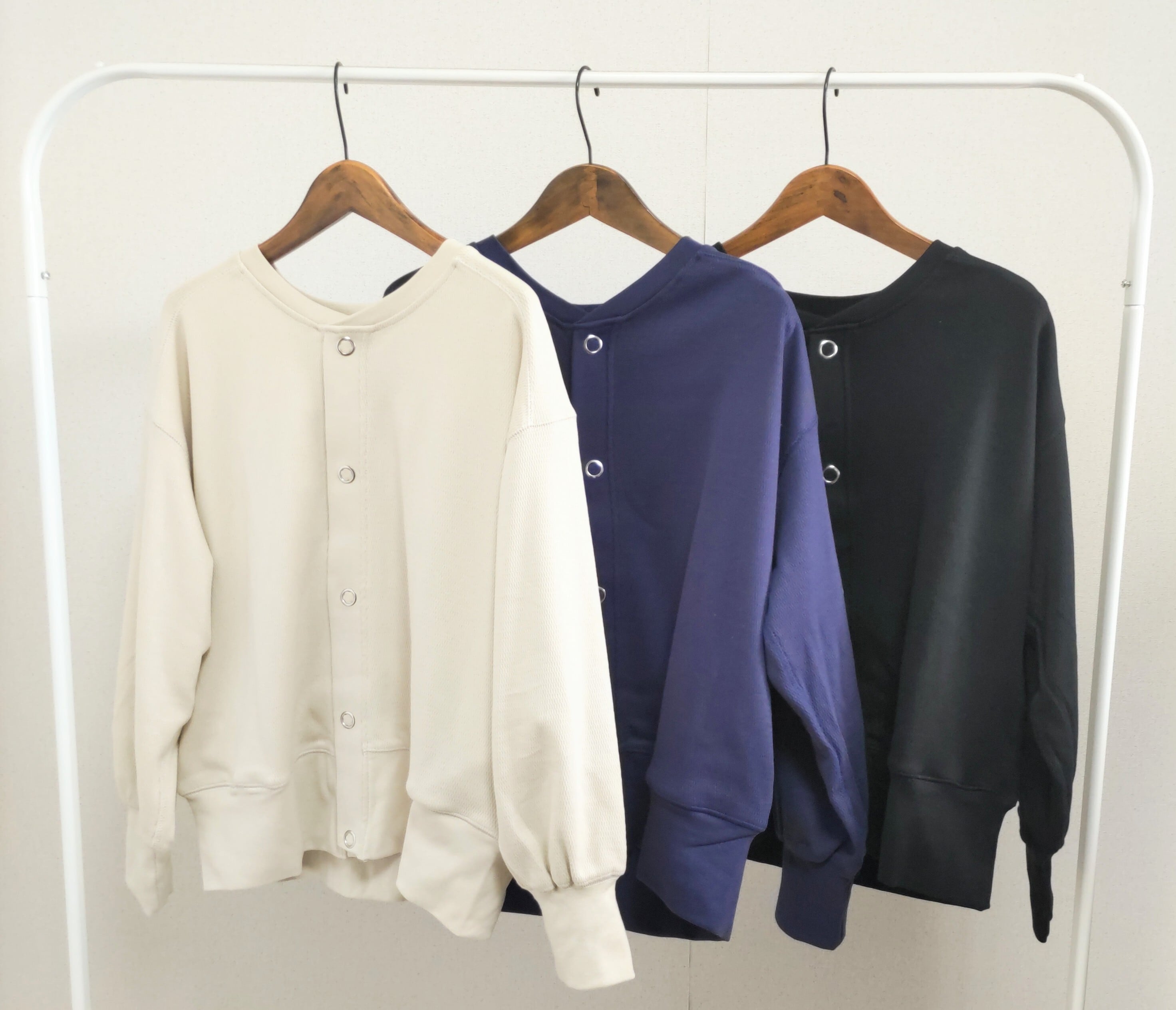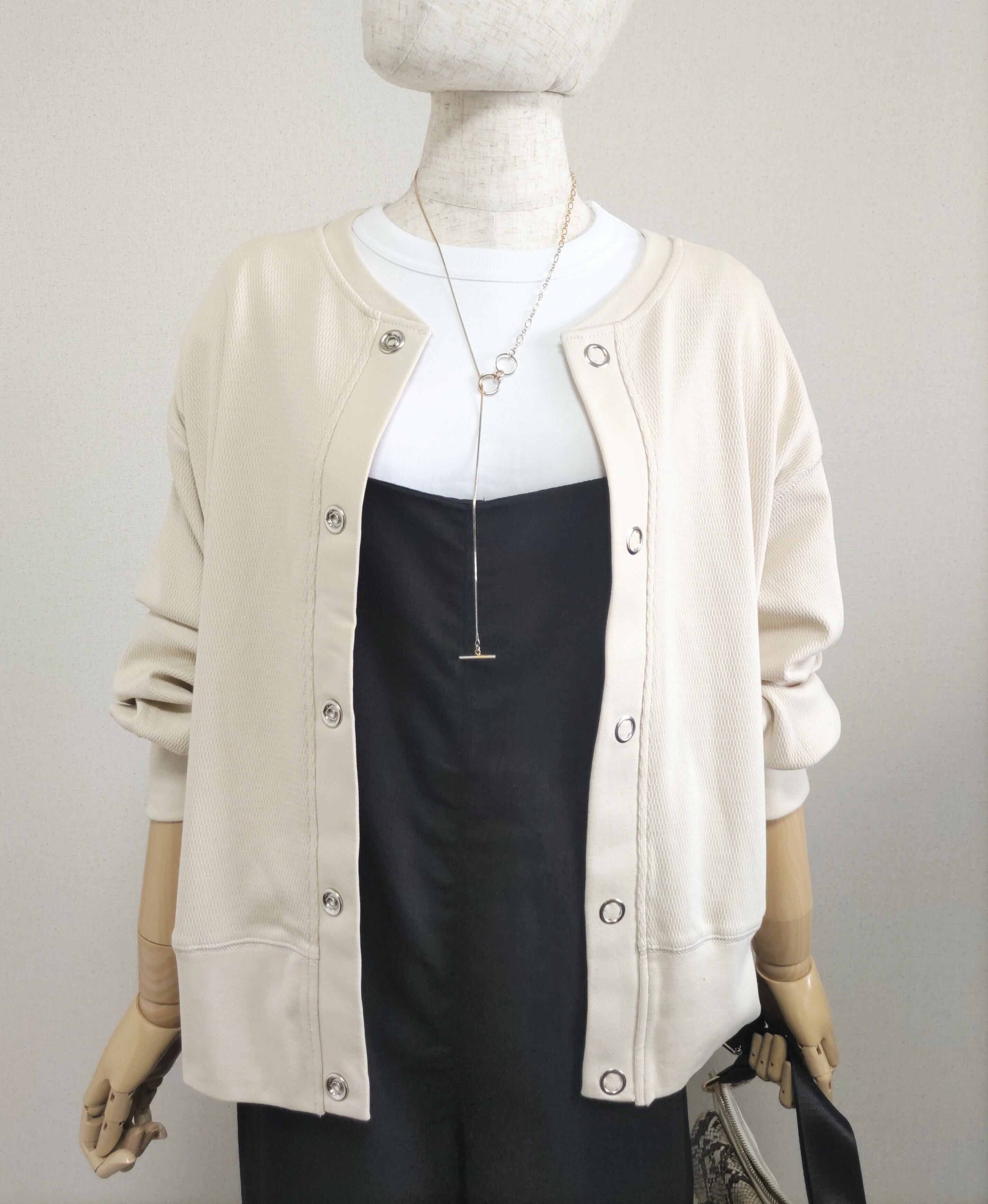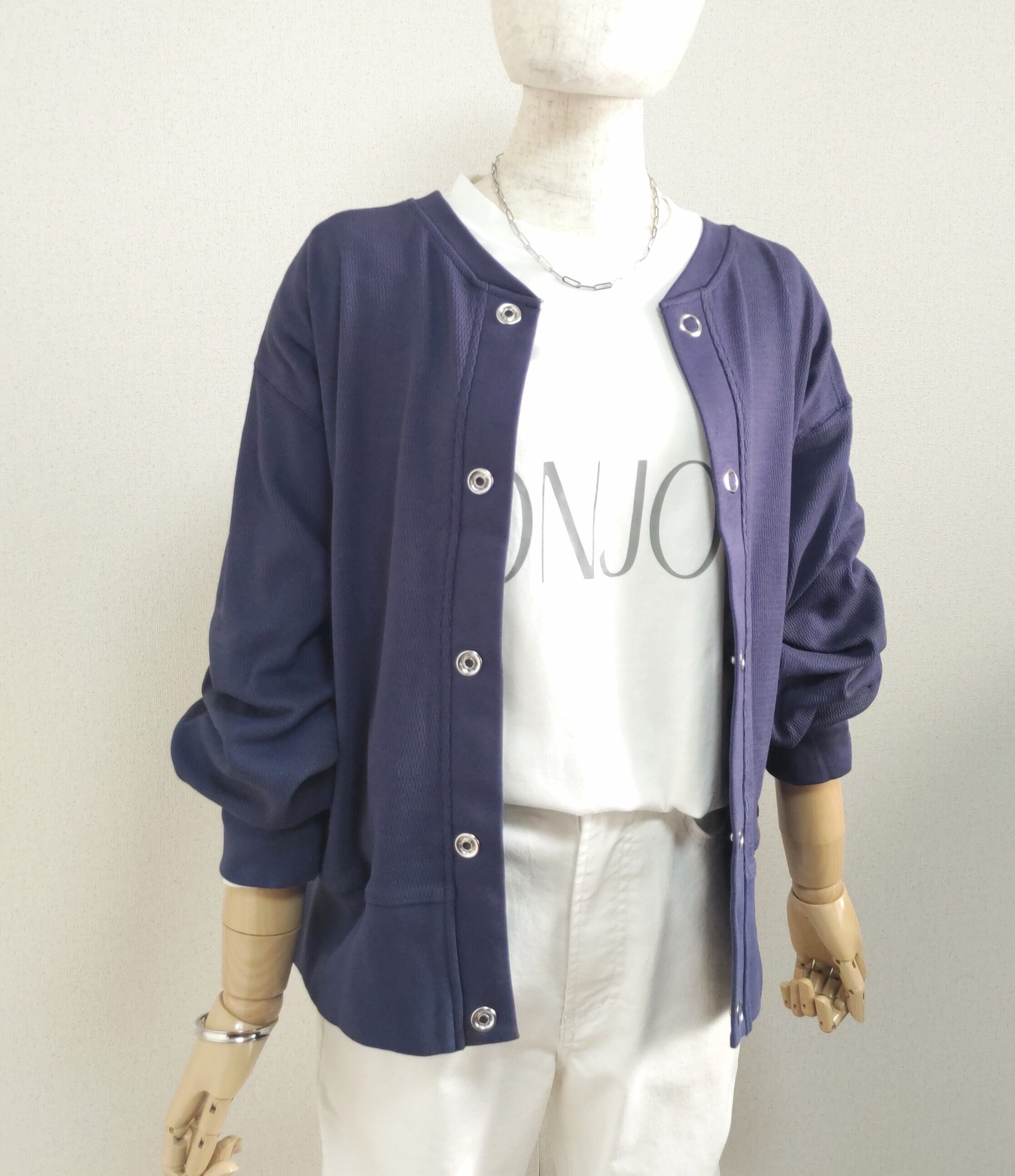 カットソー生地なのでストレッチが効いていて動きやすく、Tシャツやブラウスに気軽に羽織れます。
