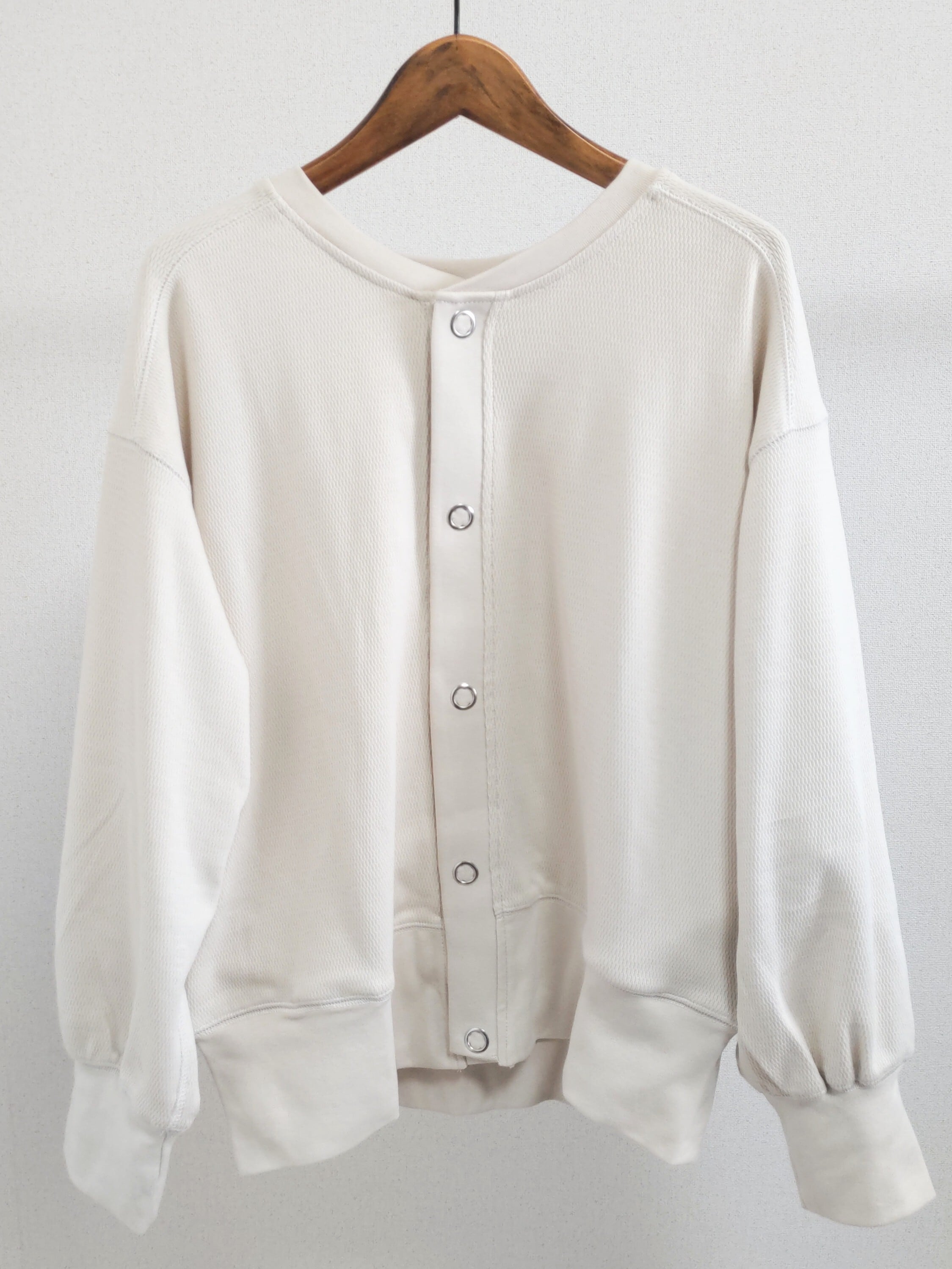 ゆったりめのアームホールにドロップショルダー、ボリュームスリーブが可愛いカーディガン。